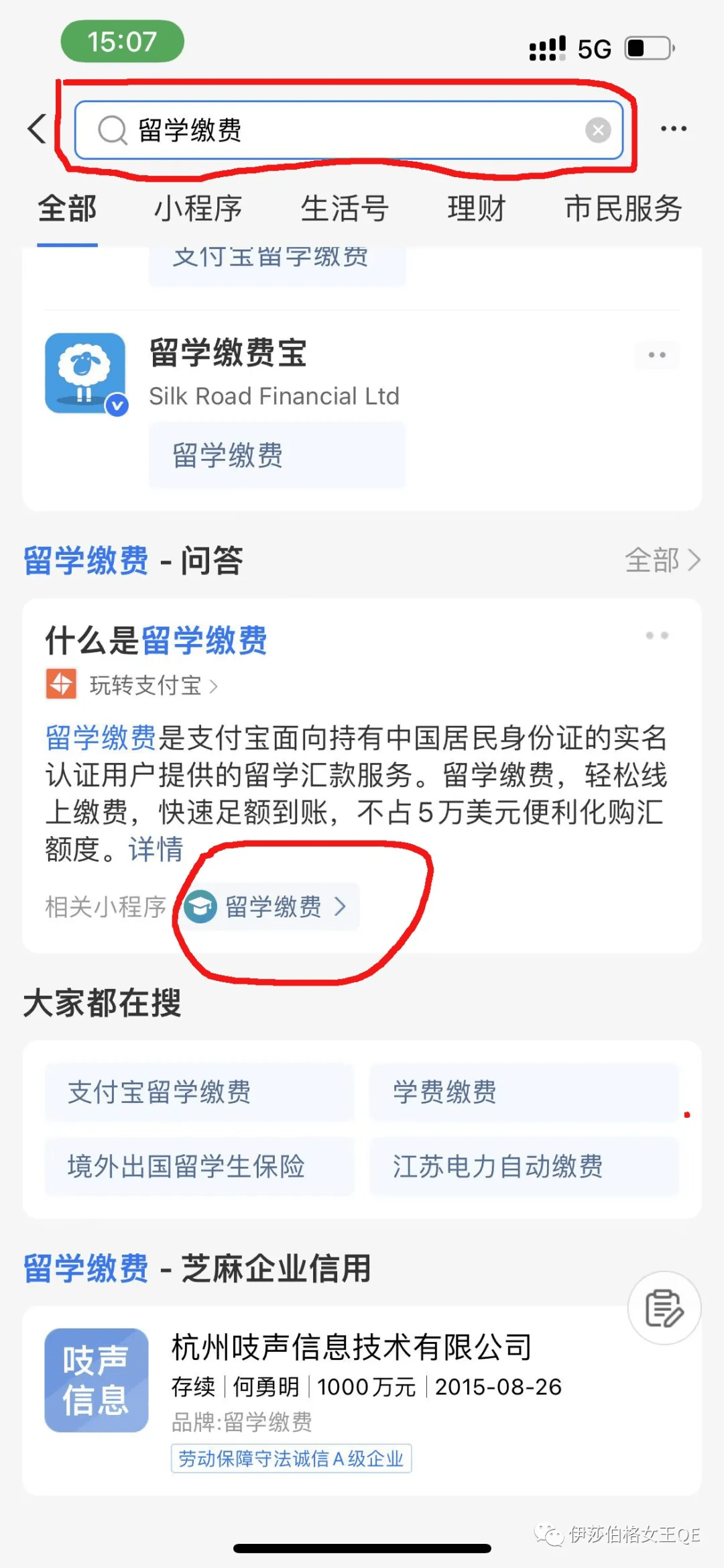 步骤一:支付宝搜索“留学缴费”,然后打开”留学缴费”小程序