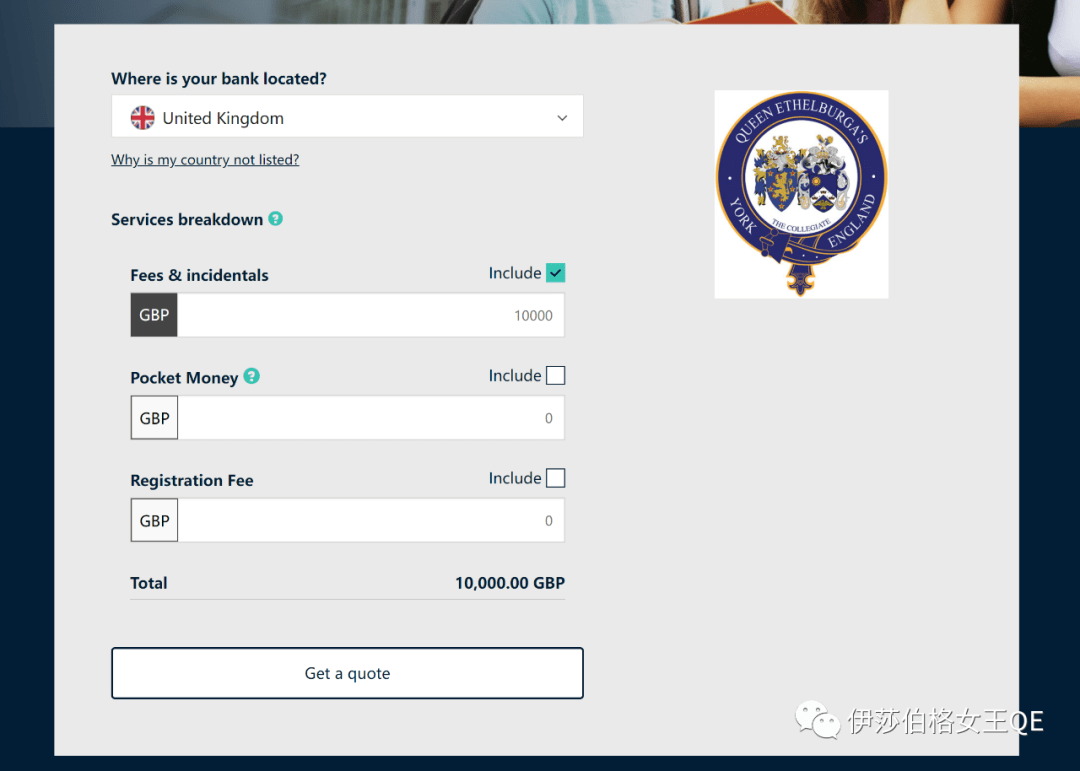 步骤二:页面跳转,如下图,选择国家和要支付费用的项目名称、填写具体金额,点击“Get a quote”按钮: