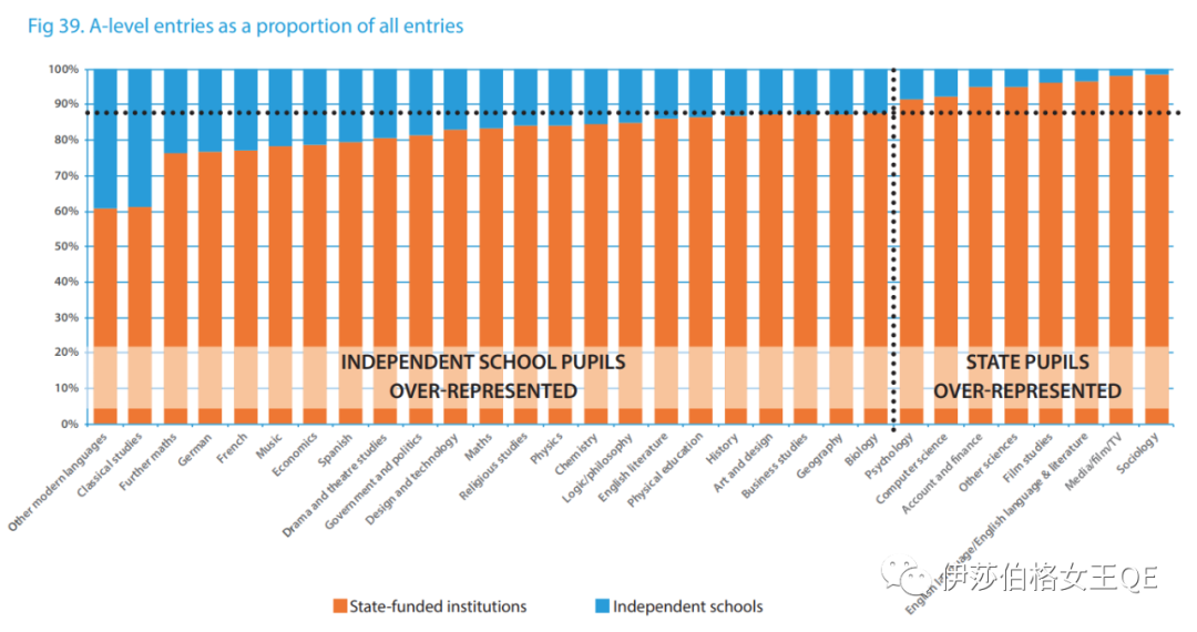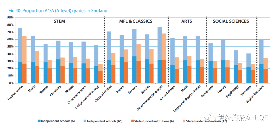 另外,尽管英国私立学校的学生人数较少,但私立学校学生在A level考试结果中获得A/A*的比率要远高于公立学校。