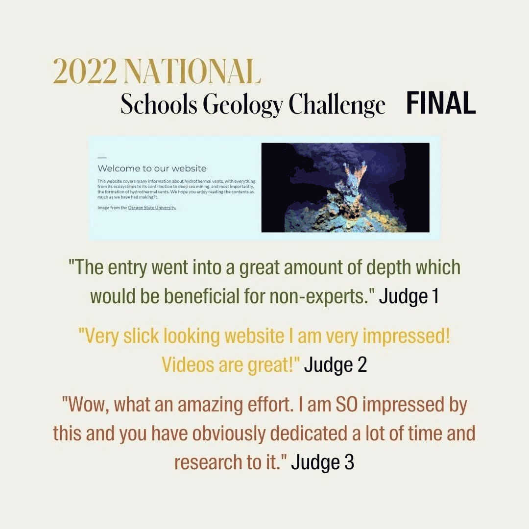 Vincent 和 Peony被邀请参加地质协会的国家地质挑战2022决赛。评委们对他们自己建立的关于热液喷口的网站评价很高!