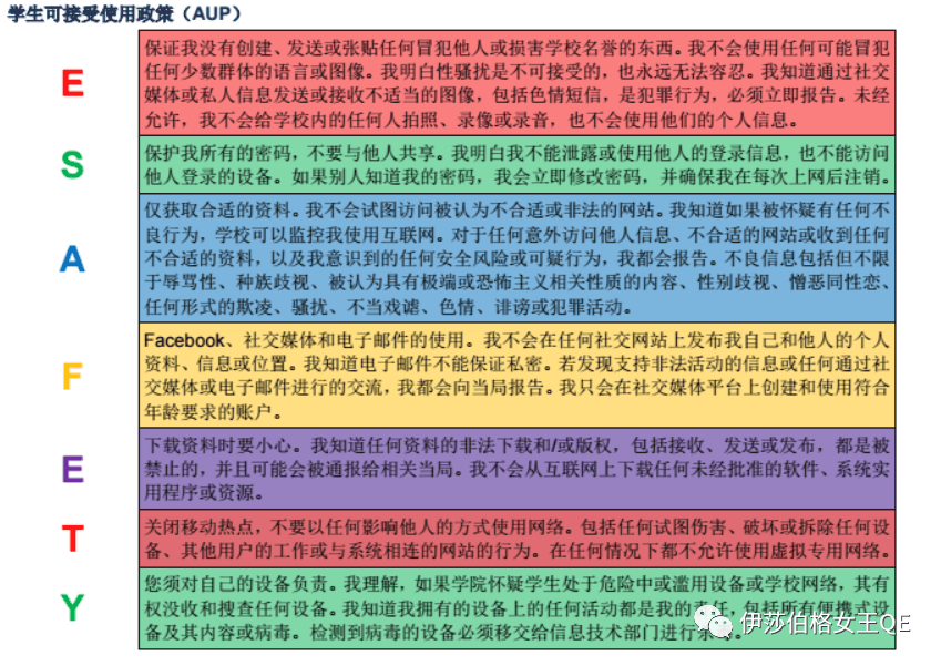 在每个学生正式入学前,学校会给家长发一个“家长手册“,学生可以通过手册第38页的”可接受的使用政策(具体如下图)“了解如何使用互联网和电子设备。