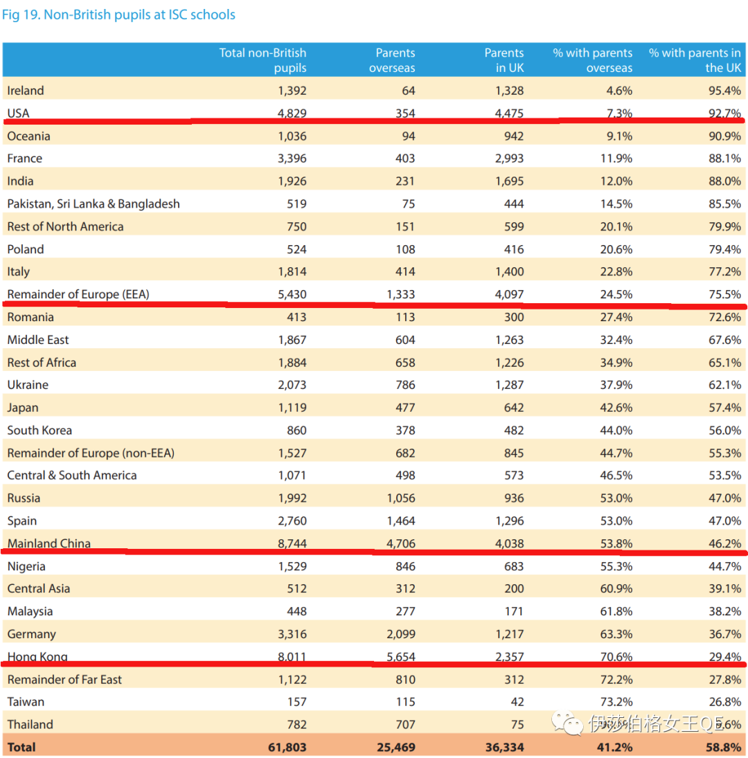 在国际生中,59%的学生父母住在英国。虽然中国大陆和中国香港仍然是英国私立学校最主要的两大生源地,但只有38.74%的中国学生家长居住在英国,远远低于总体水平。
