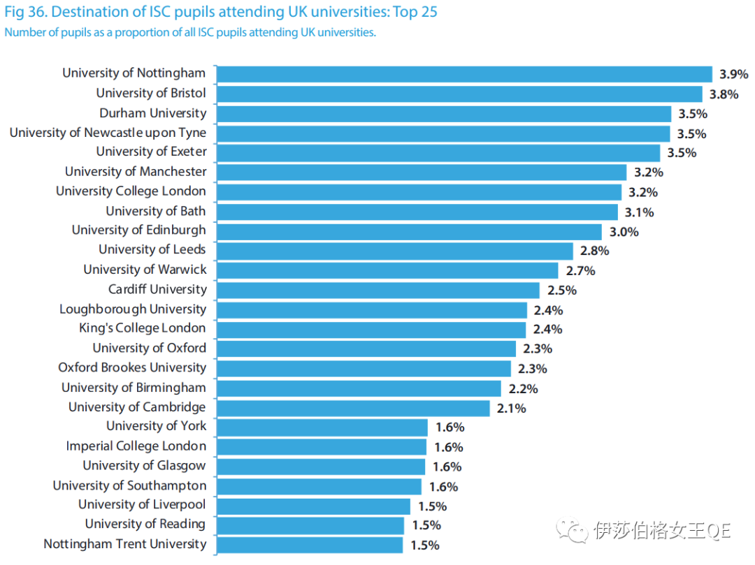 在英国Top 25的英国大学中,诺丁汉、布里斯托、杜伦等几所大学最受私立学校学生青睐;